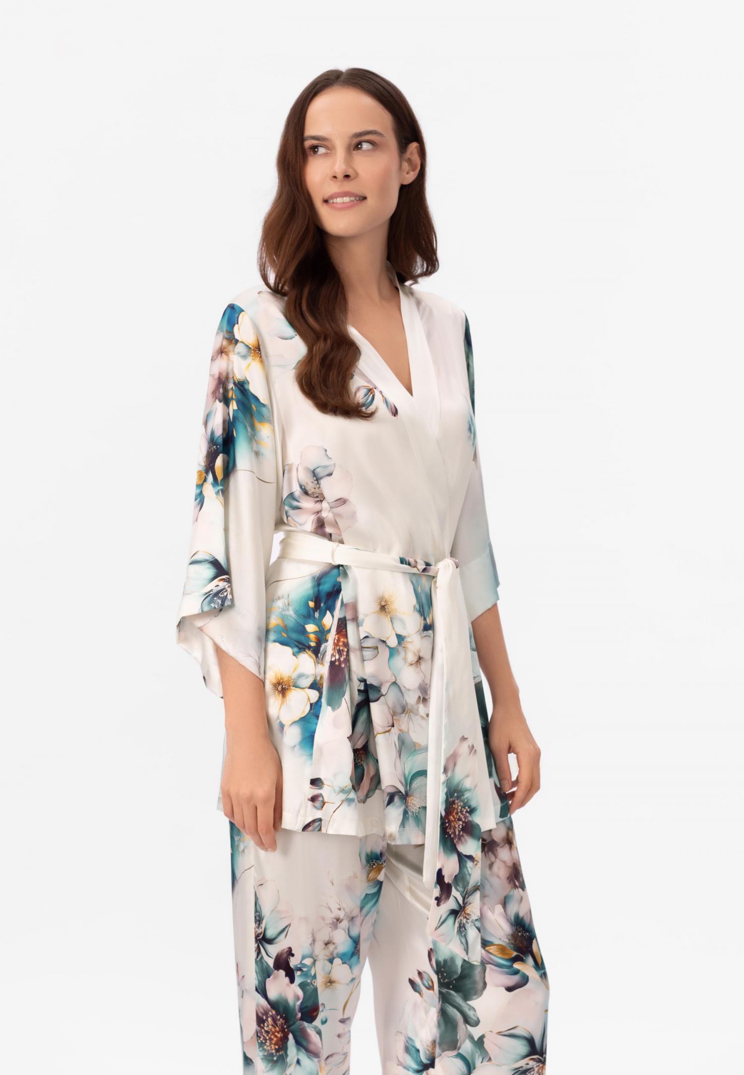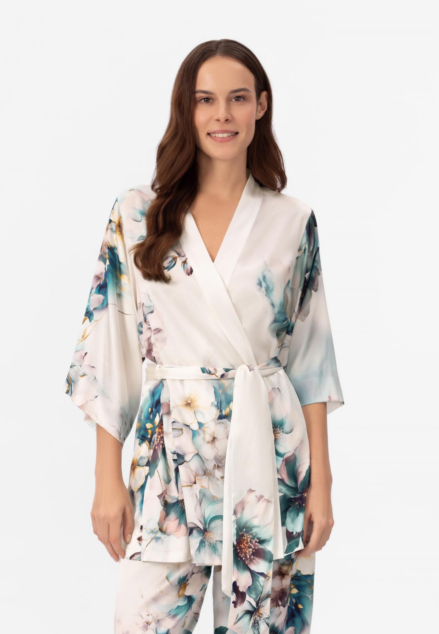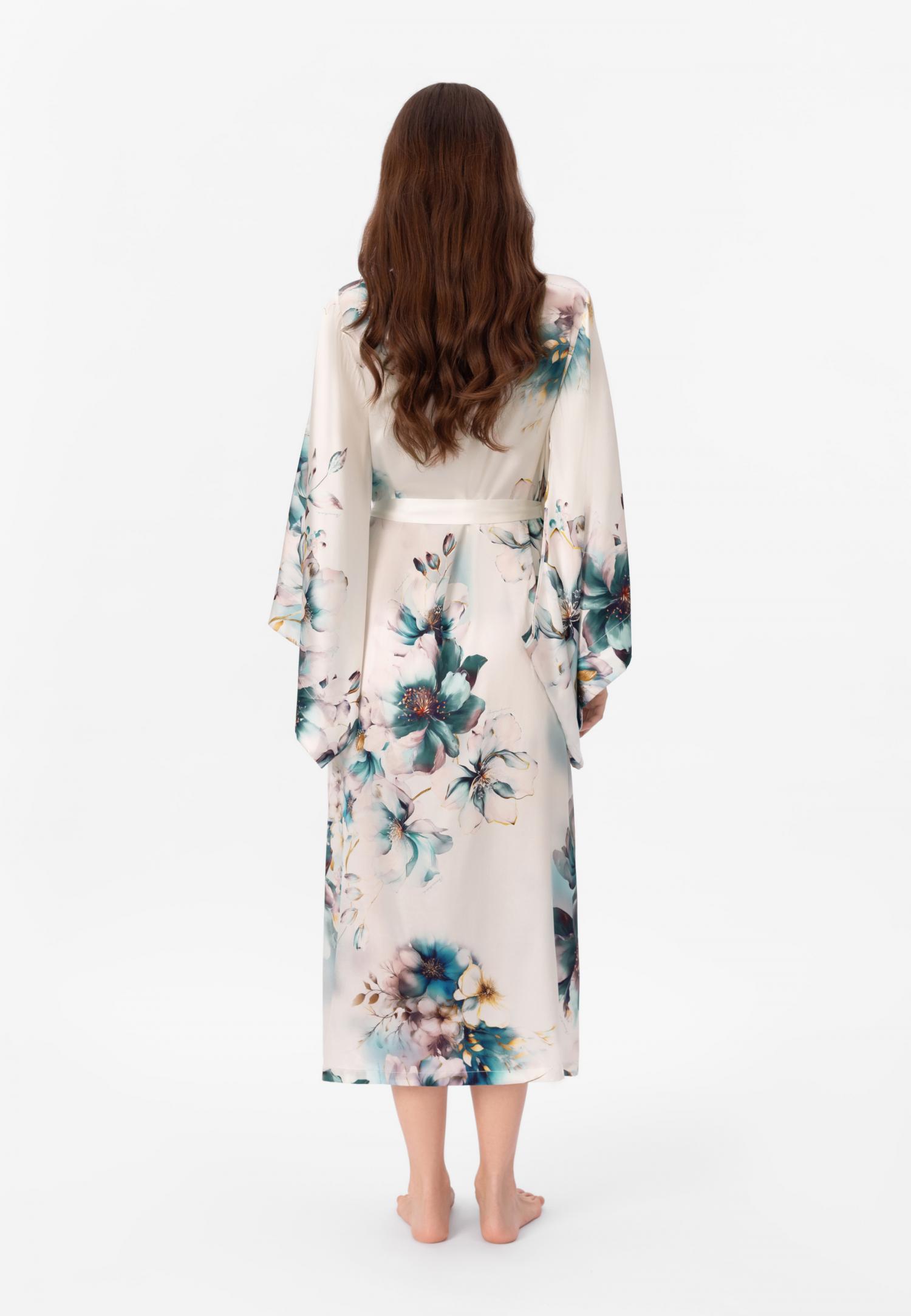 Довге шовкове кімоно вільного крою на поясі. Довжина нижче рівня колін. Широкий втачний рукав з еластичної сітки прикрашений намистинами з перлин. Спереду накладні кишені. По лінії декольте тасьма з намистинами із перлин.