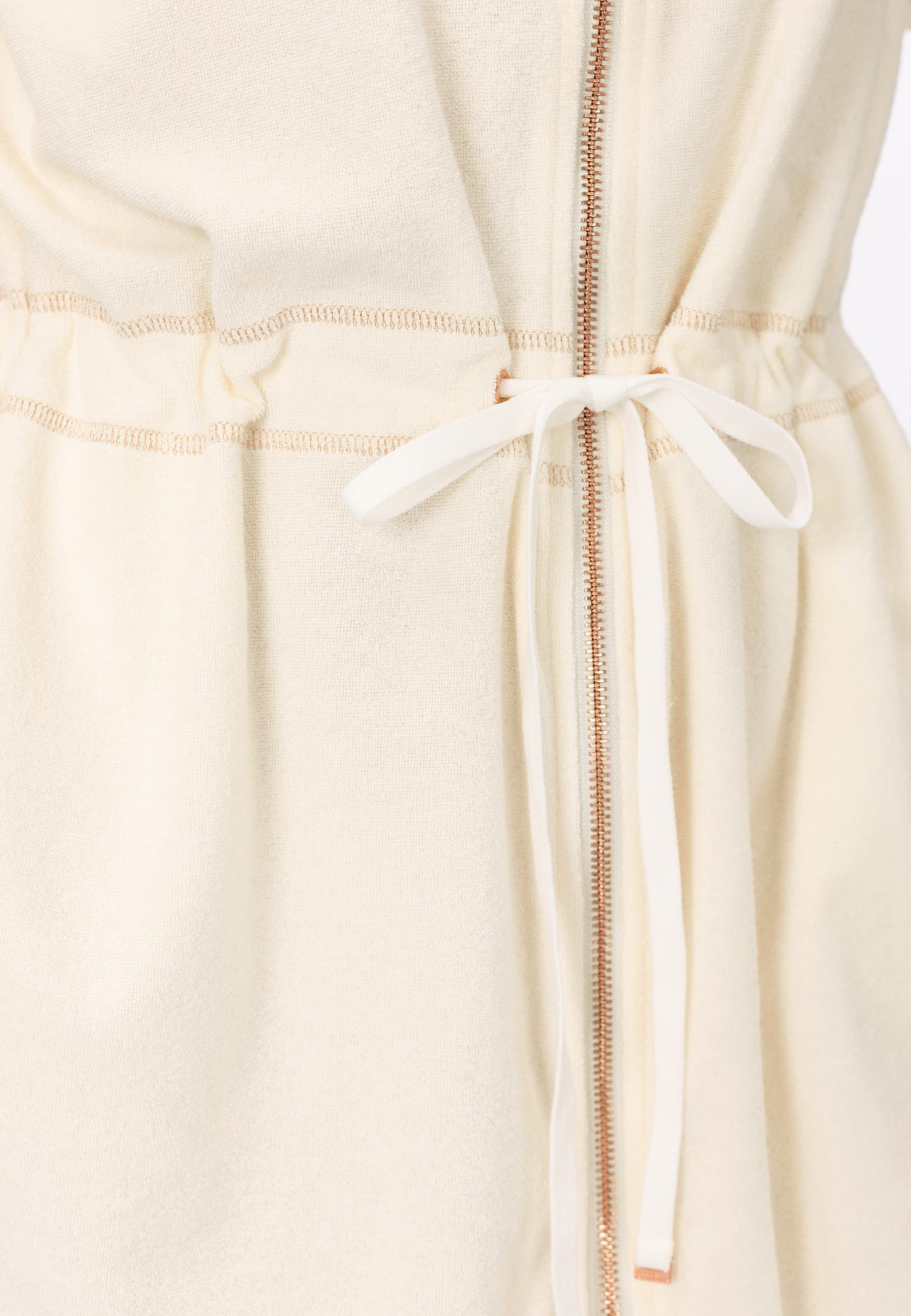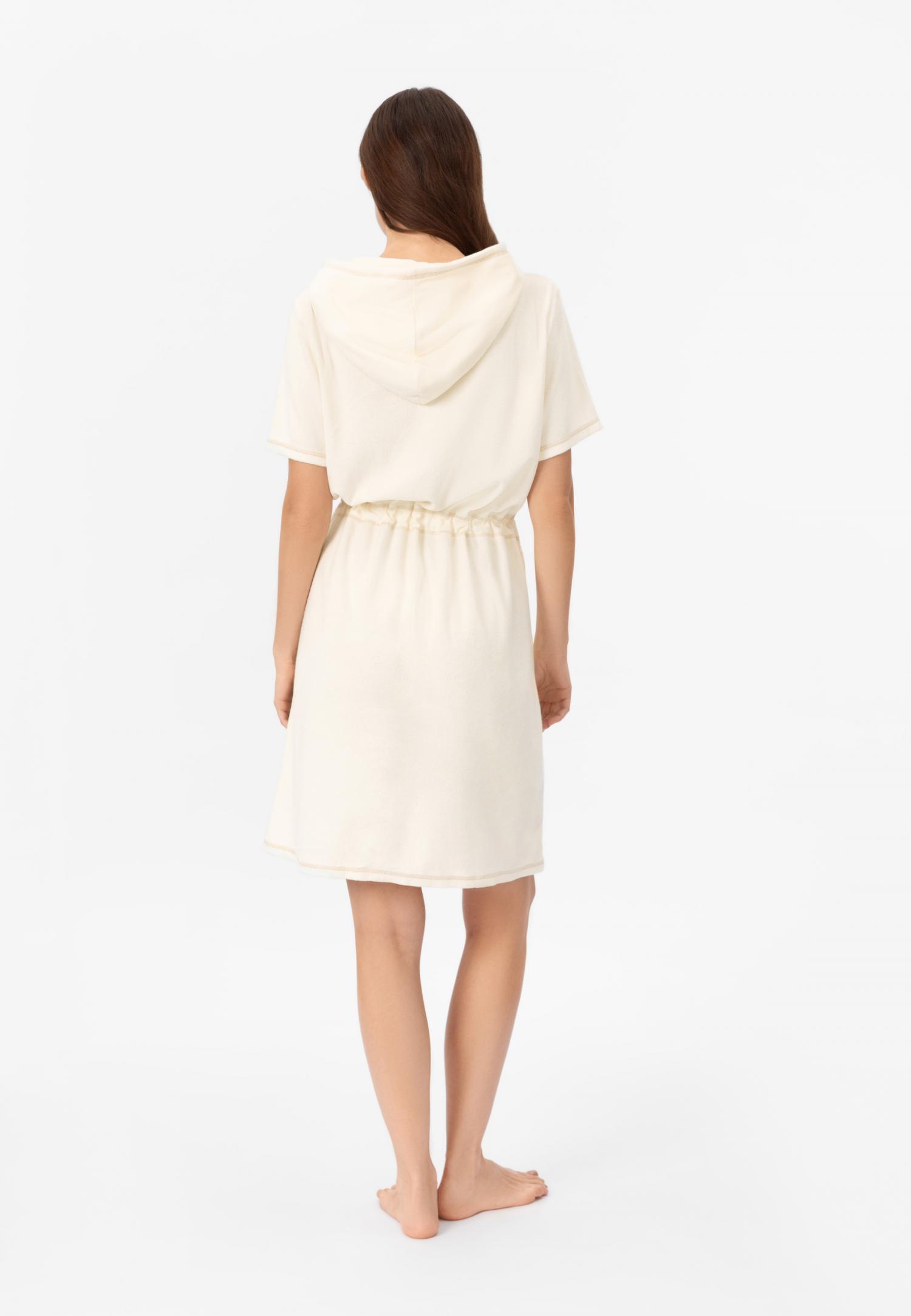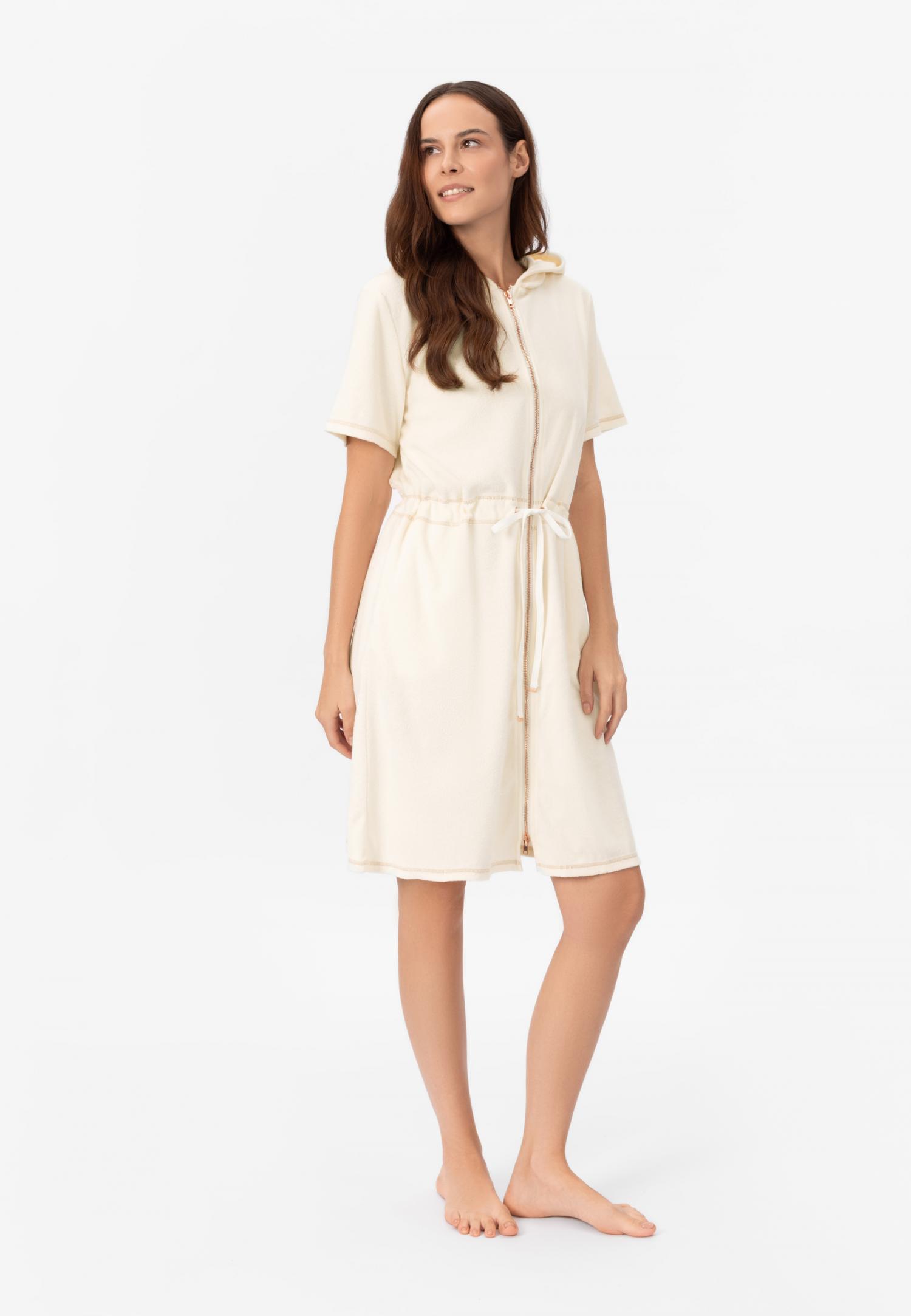 Довге шовкове кімоно вільного крою на поясі. Довжина нижче рівня колін. Широкий втачний рукав з еластичної сітки прикрашений намистинами з перлин. Спереду накладні кишені. По лінії декольте тасьма з намистинами із перлин.