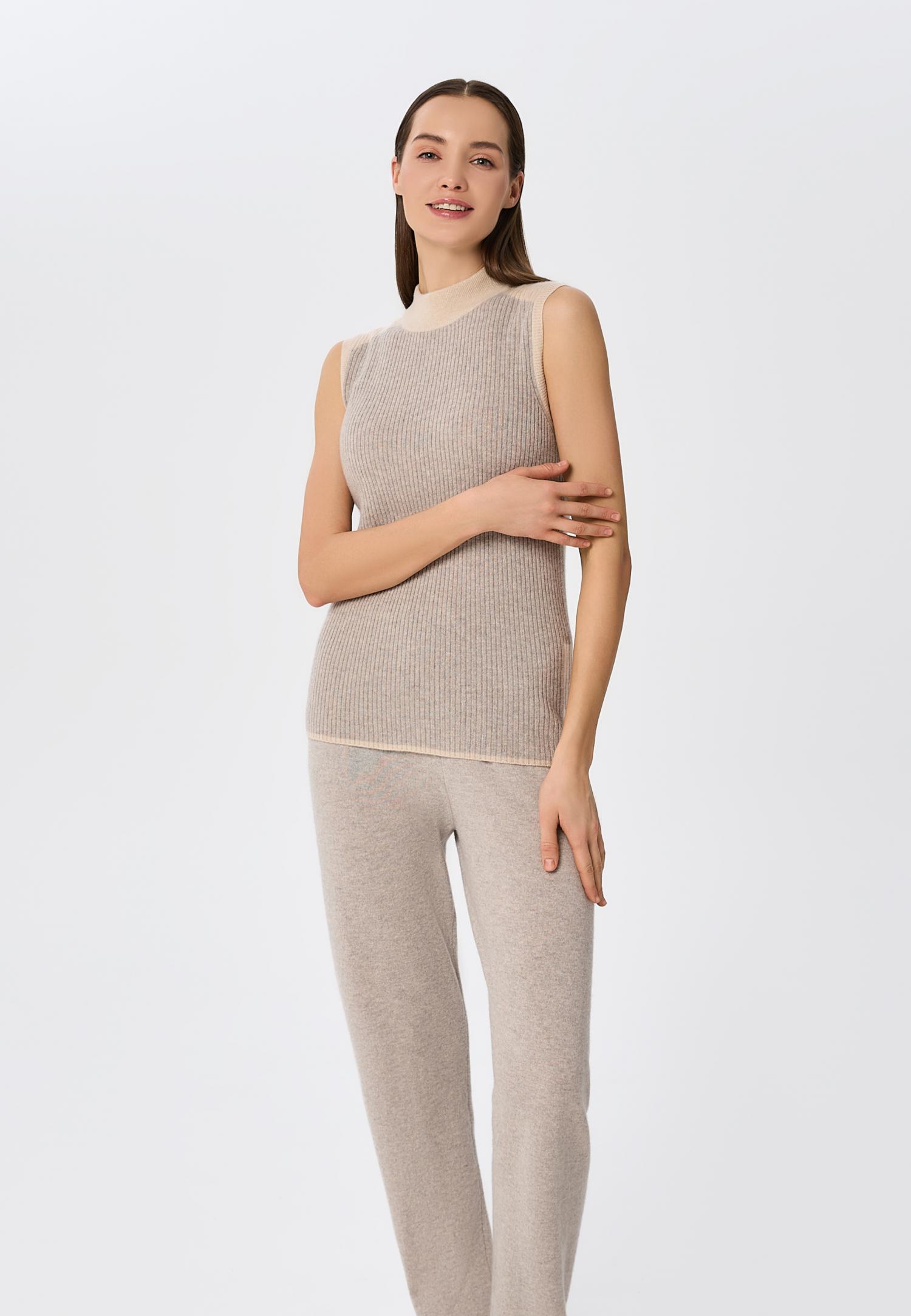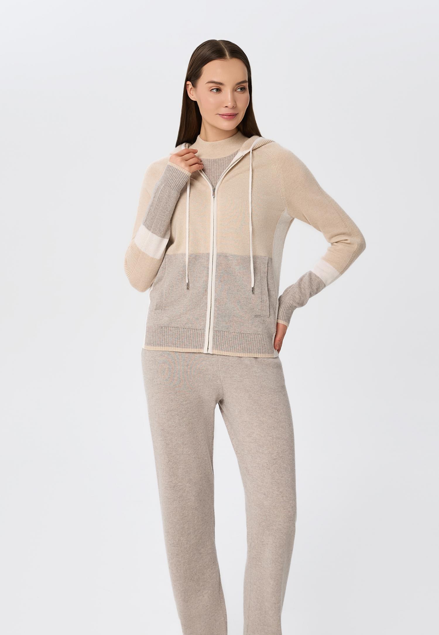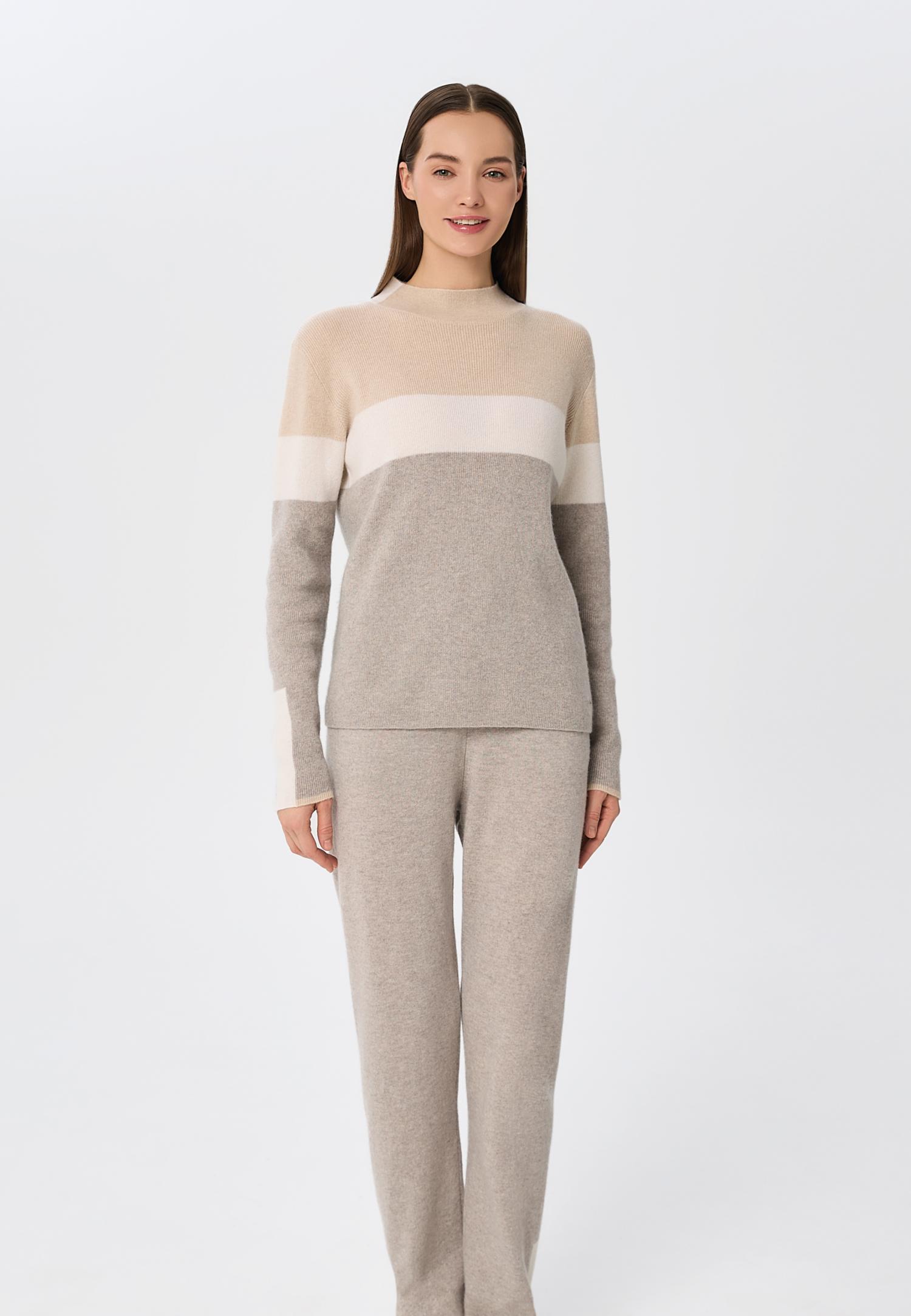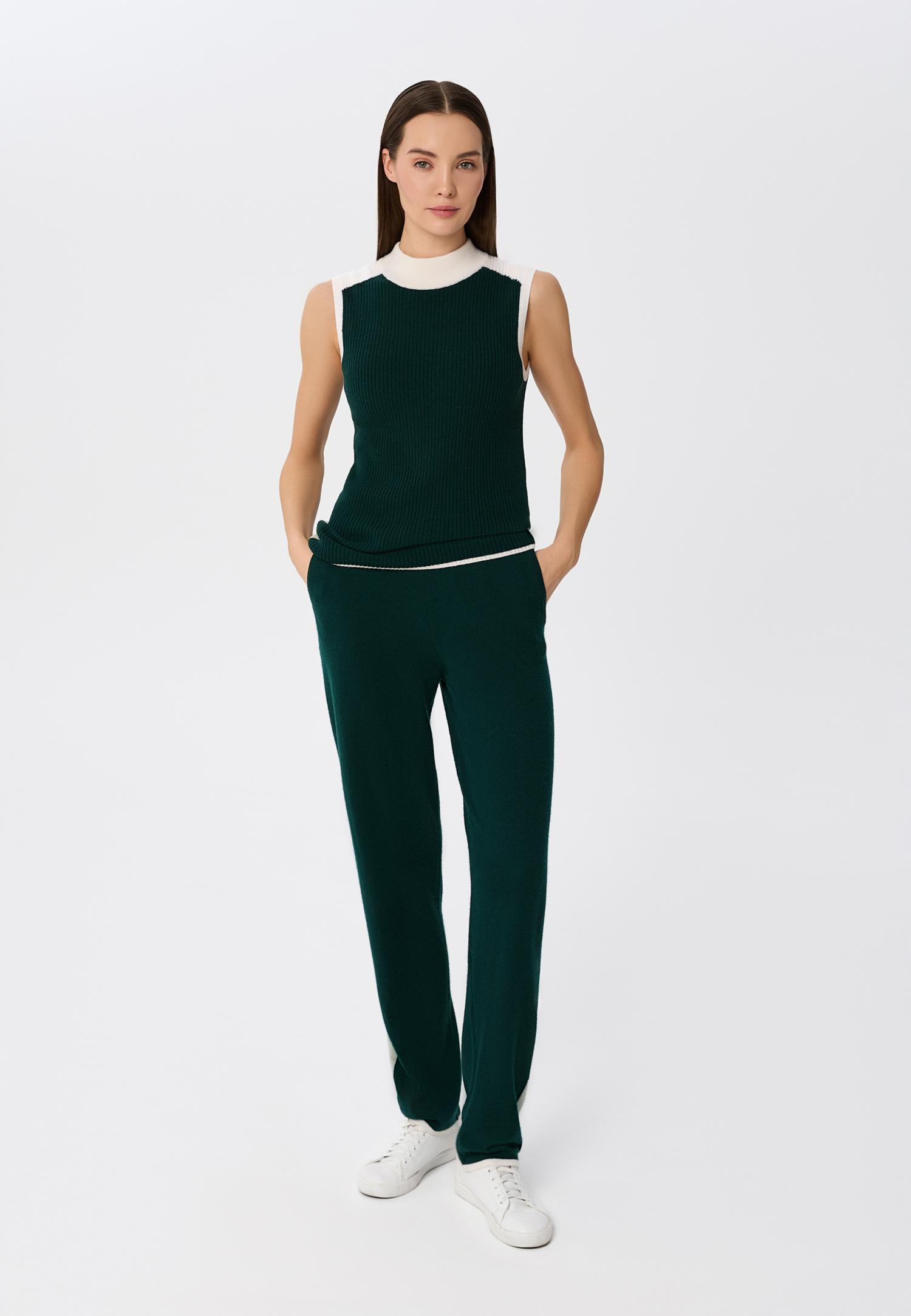 Еластичний пояс з куліскою забезпечує ідеальну посадку та свободу рухів, а контрастні деталі в стилі колор-блок на щиколотці та поясі додають родзинку та сучасний акцент в образ. М'який кашемір не тільки тішить тактильними відчуттями, а й створює атмосферу спокою протягом усього дня.