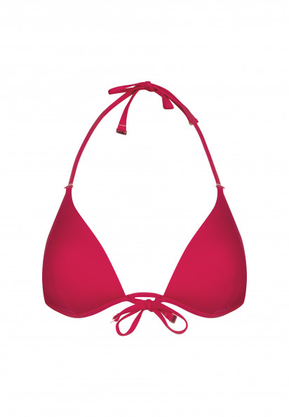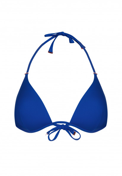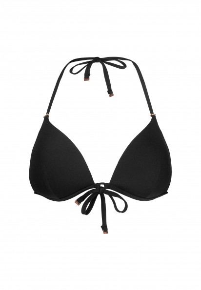 Верх купальника з формованими трикутними чашками без кісточок. Знімні вкладиші пуш-ап. Зав'язки на шиї. На спині застібка на маленький гачок. По центру зав'язки, за допомогою яких можна регулювати відстань між чашками.