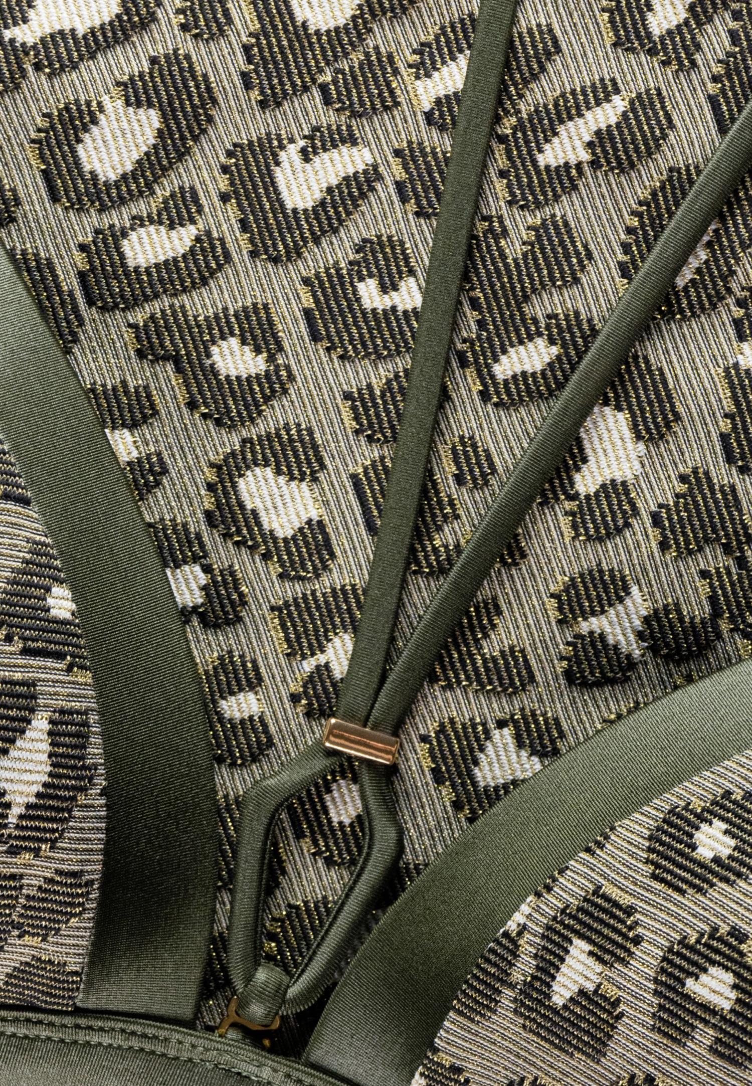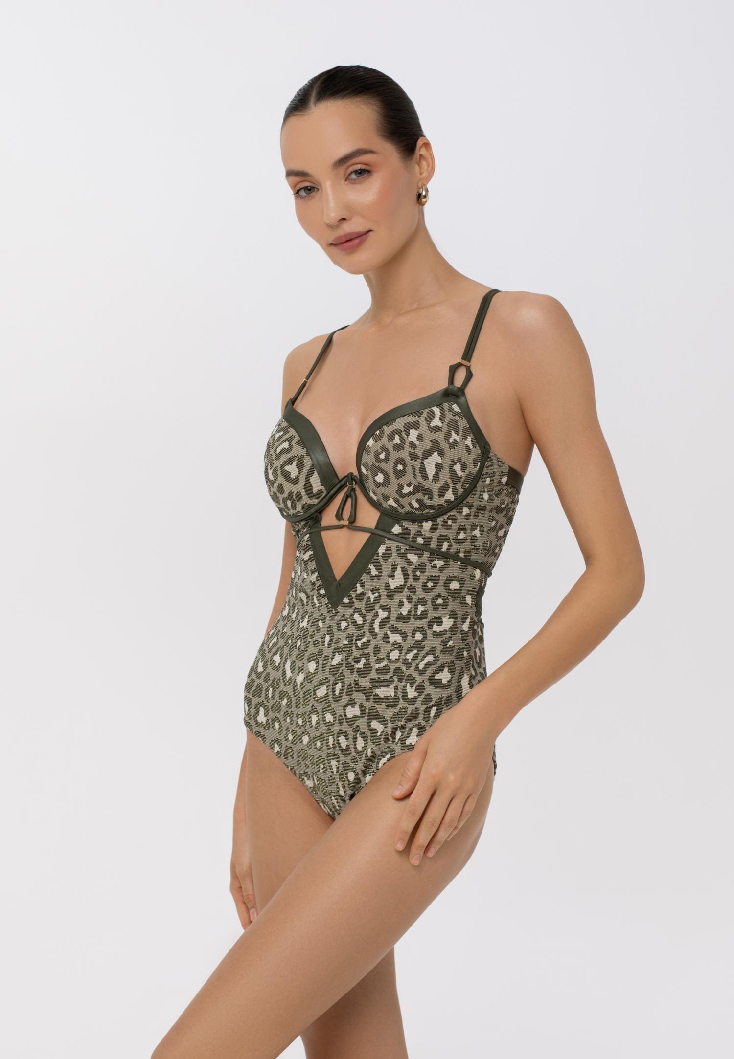 Суцільний купальник із м'якими чашками «бандо» на кісточках. Усередині тонкі знімні коректори. Знімні широкі регульовані бретелі. Фігурний виріз спереду. Асиметричні вставки на передній деталі.