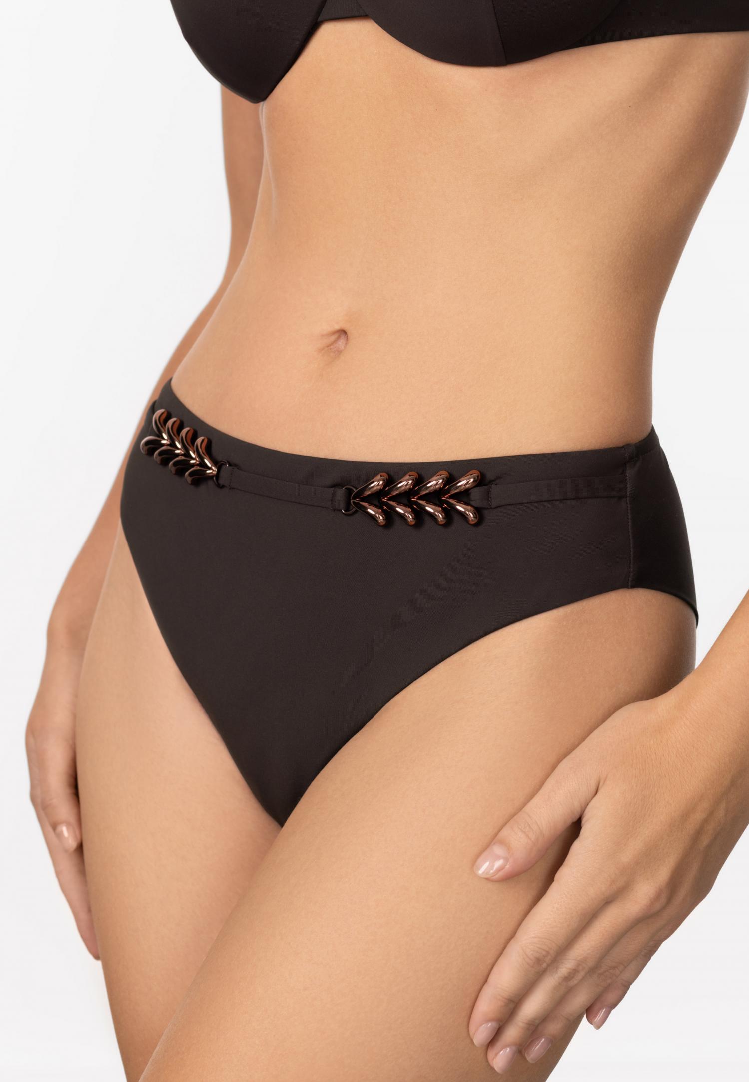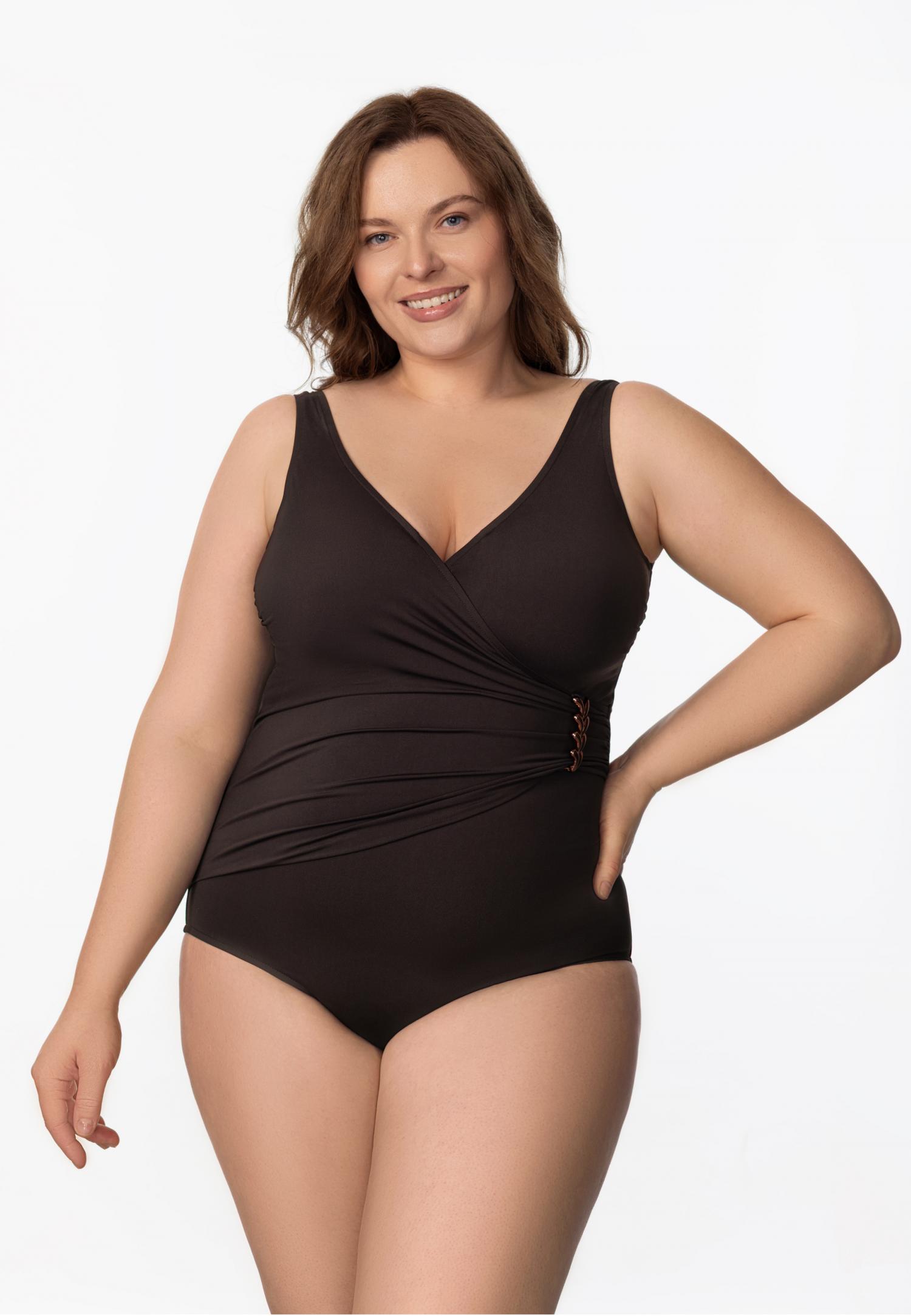 Купальник з тонкими знімними коректорами і резинкою під грудьми ідеально підкреслює силует. На передній деталі — глибокий виріз, ефектно зафіксований еластичним шнуром з основної тканини, що створює спокусливий акцент. Декоративний пояс з аксесуарами підкреслює талію. Регульовані бретелі дозволяють налаштувати посадку, а завищений виріз по лінії бікіні візуально подовжує ноги.