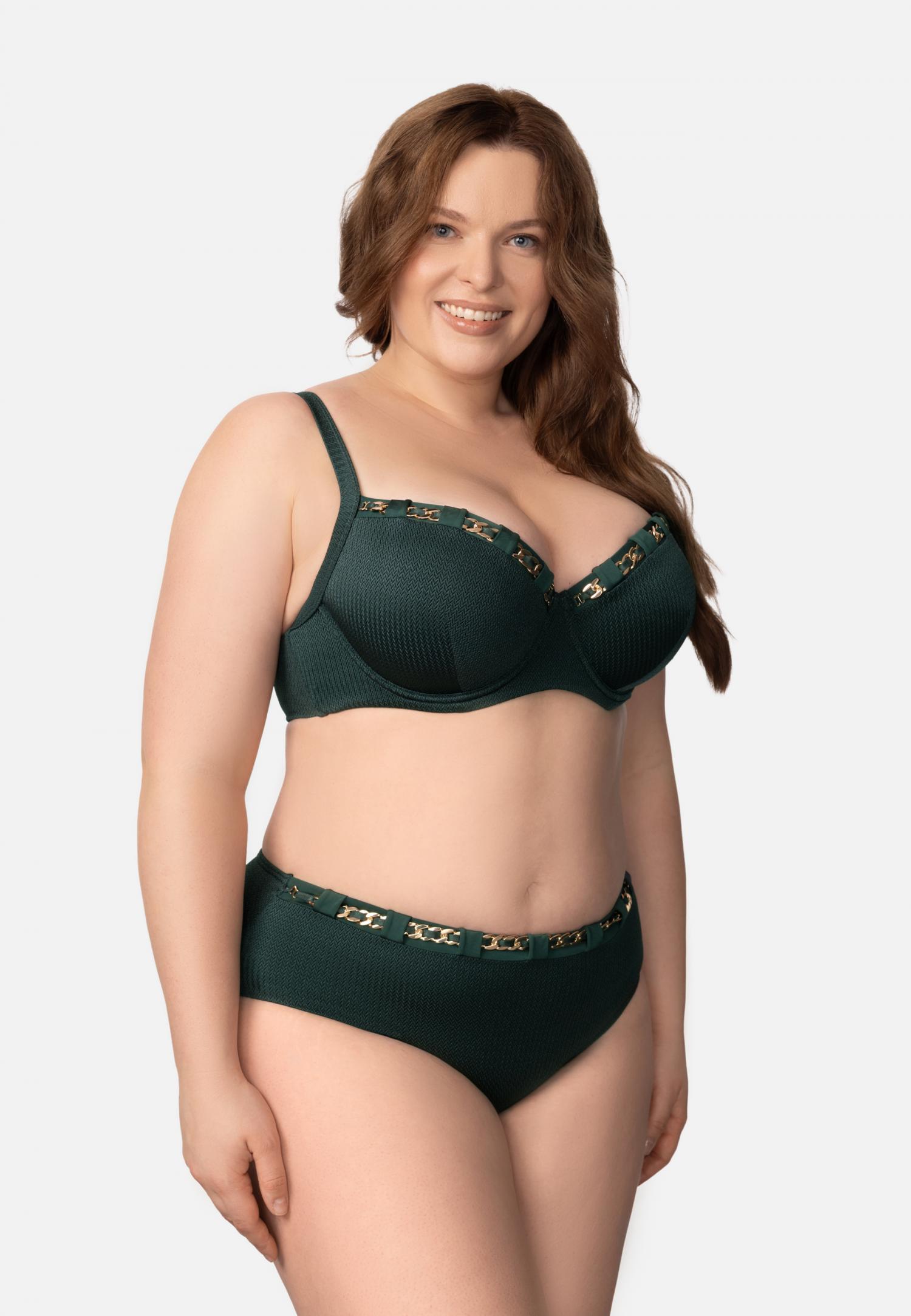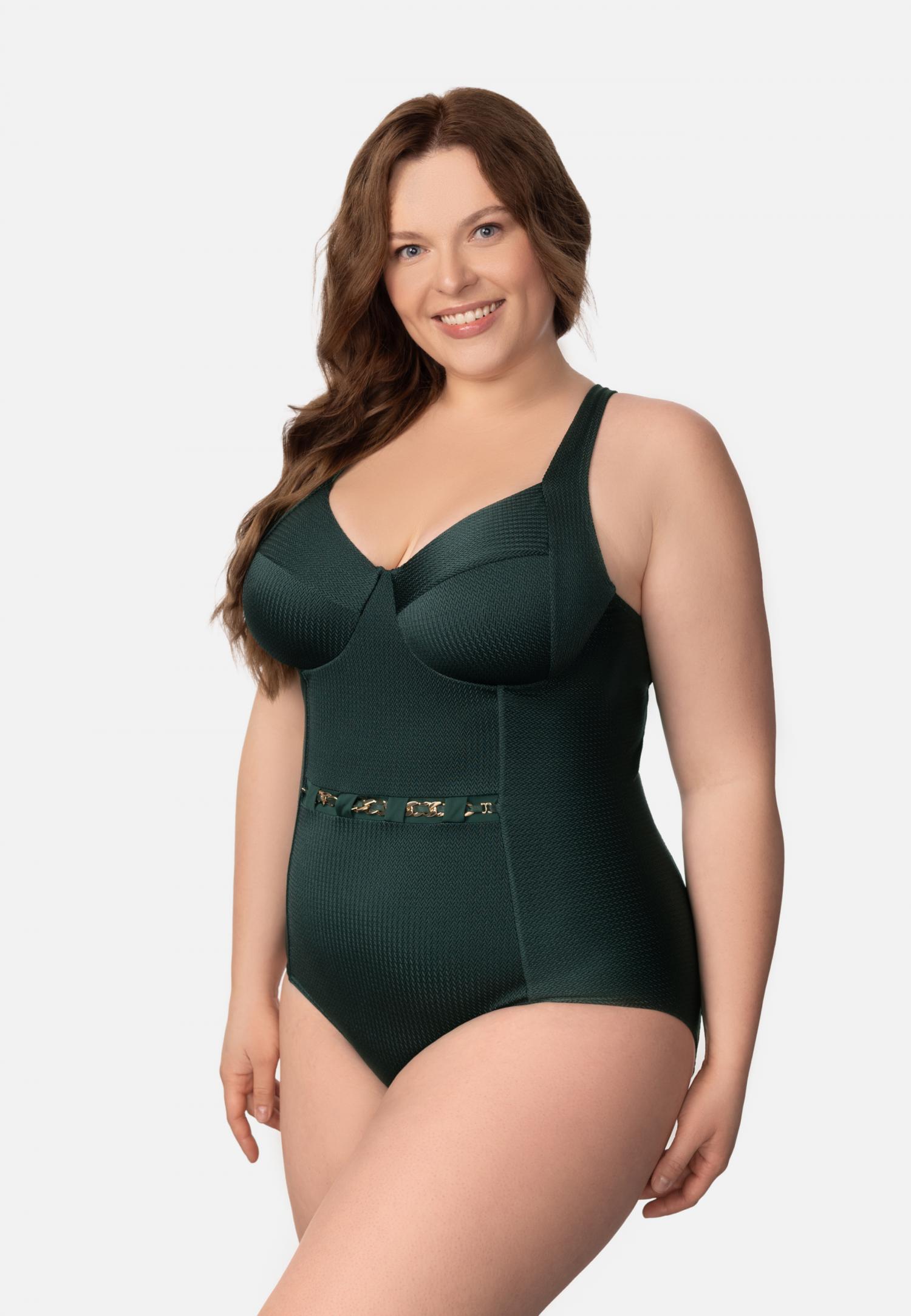 Купальник з формованою чашкою на каркасній підтримці зі знімними коректорами «пуш-ап» підкреслює форму грудей. Регульовані бретелі і застібка на спині забезпечують ідеальну посадку, а відкрита спина додає легкості і шарму. Вставка з атласу по лінії талії з шльовками під декоративний знімний пояс-ланцюжок створює елегантний акцент і підкреслює талію.