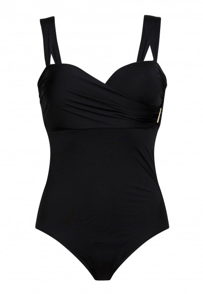 Купальник з формованою чашкою «бандо» на каркасній підтримці. Вбудований «пуш-ап», витончені знімні бретелі, асиметричне драпірування на ліфі, металевий аксесуар.