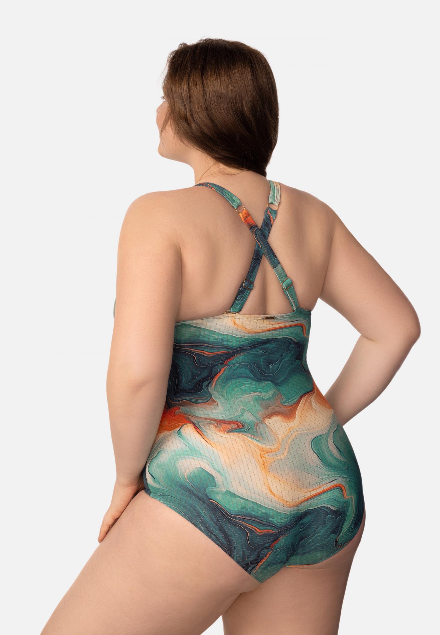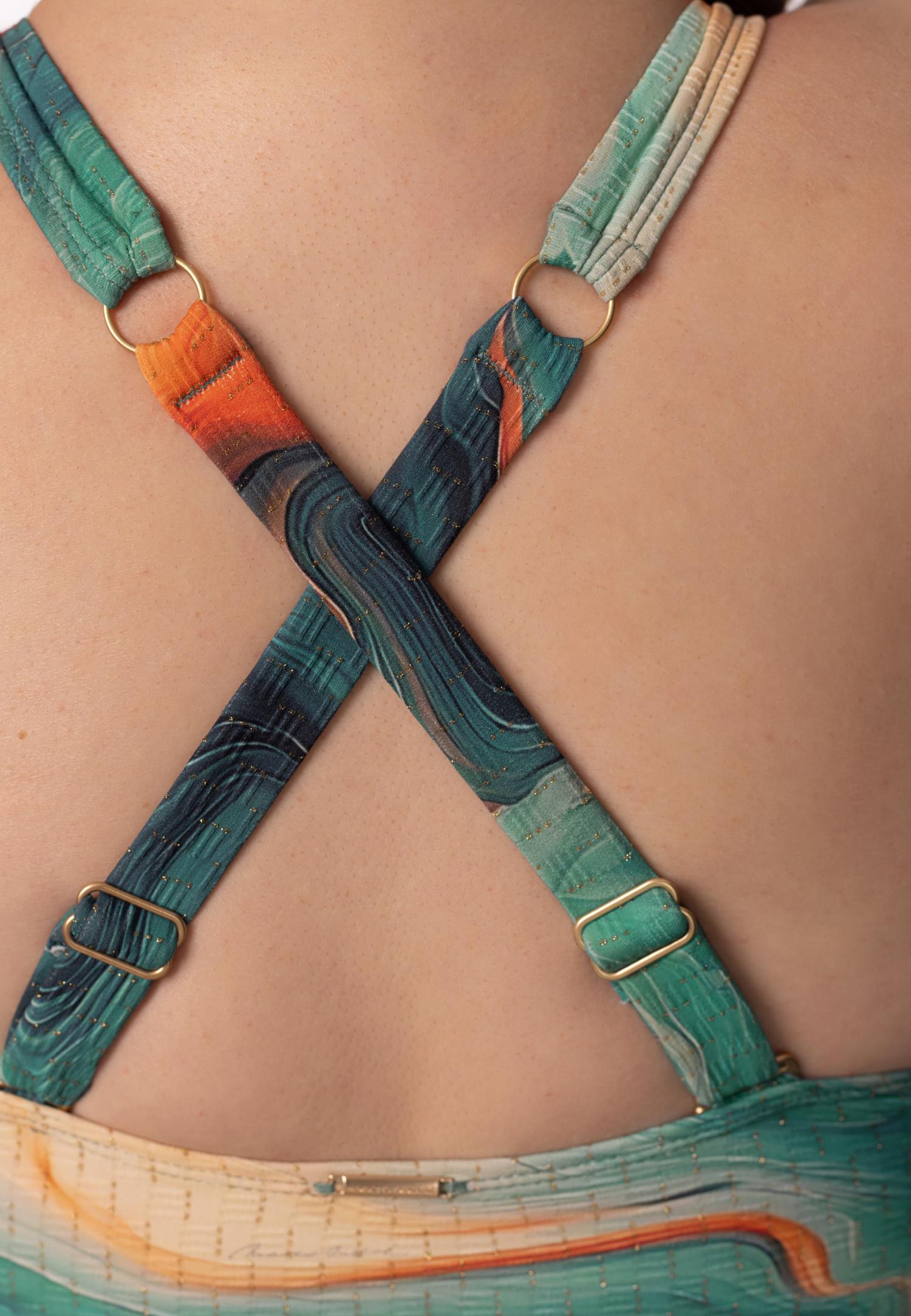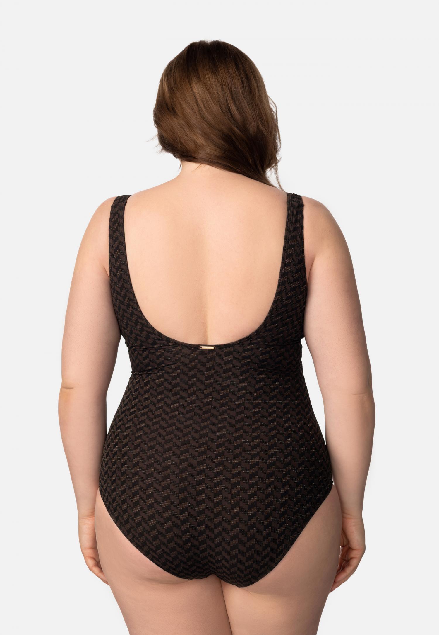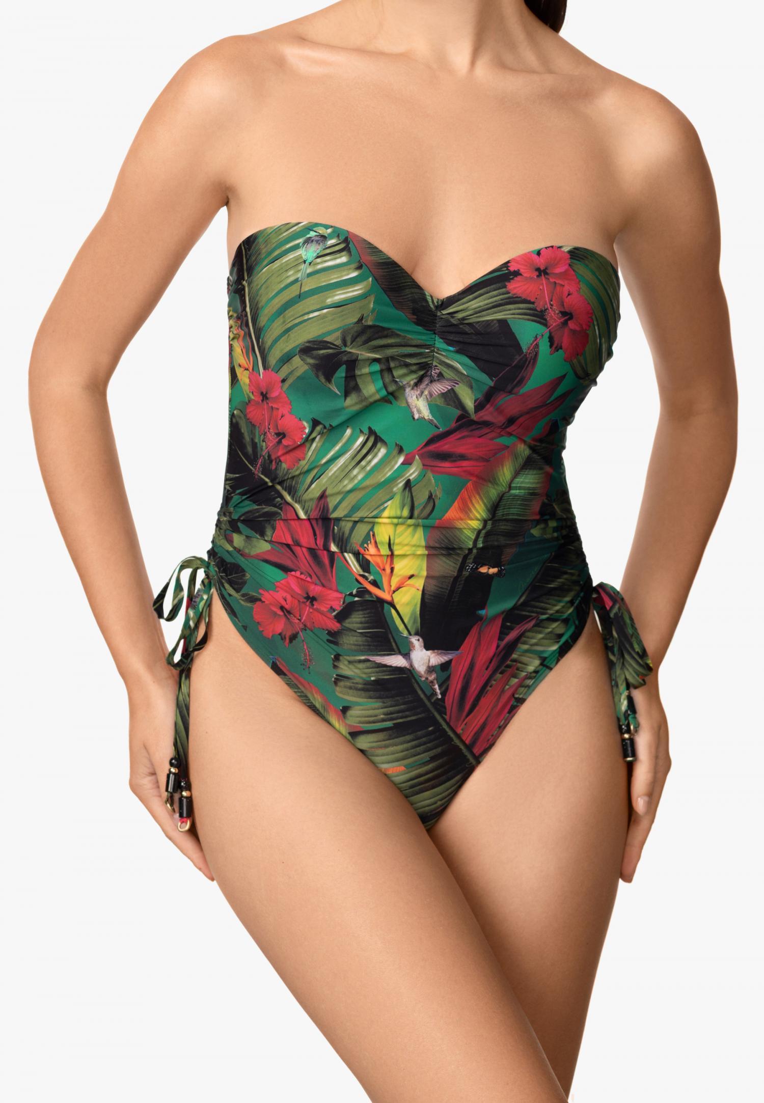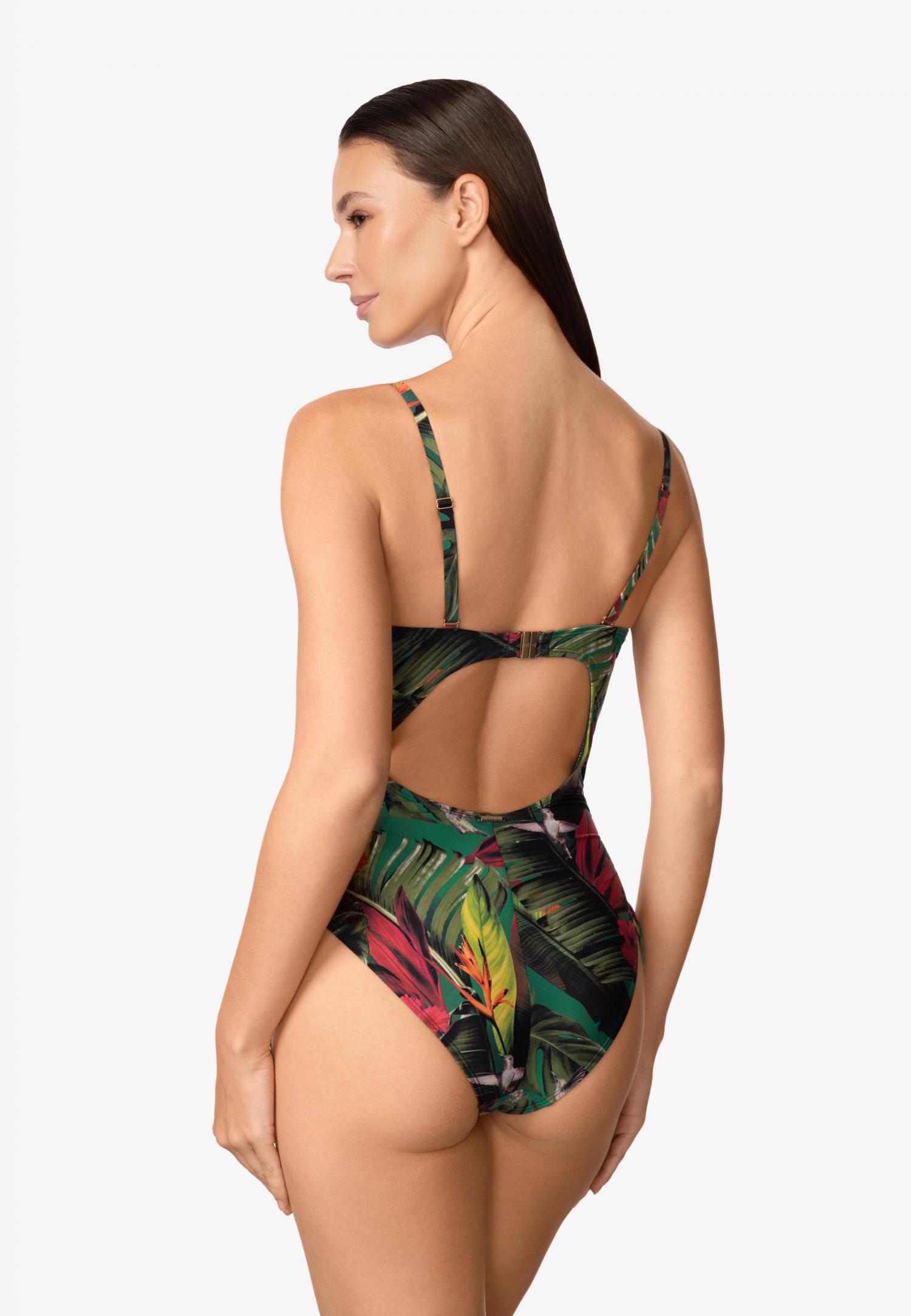 Купальник з формованою чашкою на каркасній підтримці з вбудованим «пуш-ап». Зав'язки з бічнимпідкроєм для додаткової підтримки грудей. Спереду є декоративний бантик, що знімається. Відкрита спина. На спині є застібка.