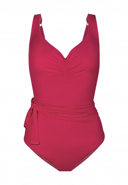 Серія класичних однотонних купальників. Купальники виконані з матеріалу з волокном "LYCRA ADAPTIV". Вироби з цих матеріалів ідеально сідають по фігурі будь-якого типу і в міру збільшення розміру еластичність виробів зростає. Суцільний купальник із формованими чашками на кісточках. Чашки Full Cup ідеально підійдуть власницям пишних форм. Бретелі регулюються за довжиною. Жіночний виріз по лінії декольте вигідно підкреслює груди. М'які бретелі збільшеної ширини забезпечать комфорт для великих грудей. Декоративна збірка і знімна зав'язка на одному боці. Для додаткової підтримки всі деталі продубльовані підкладкою. Класичний виріз по лінії бікіні.