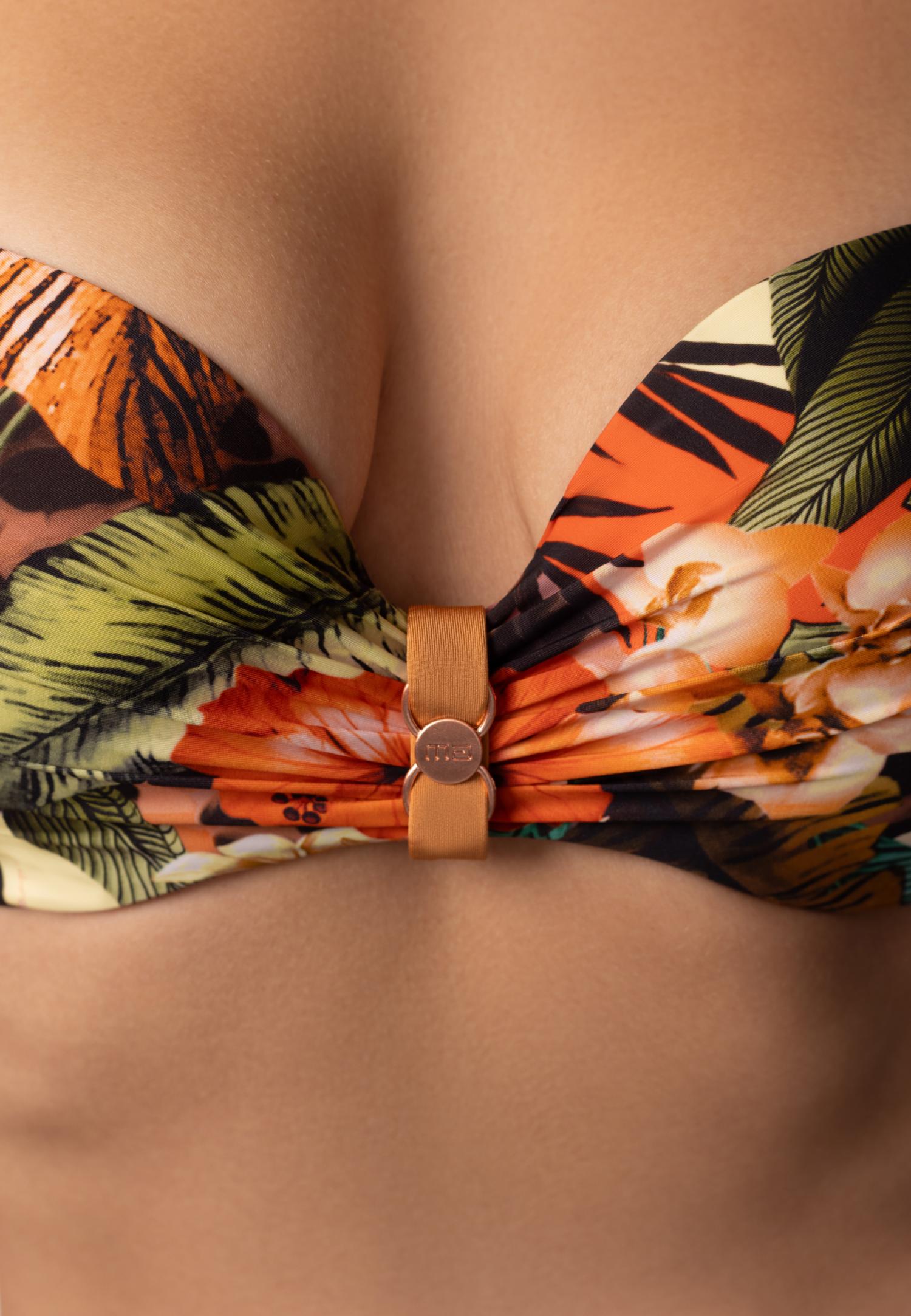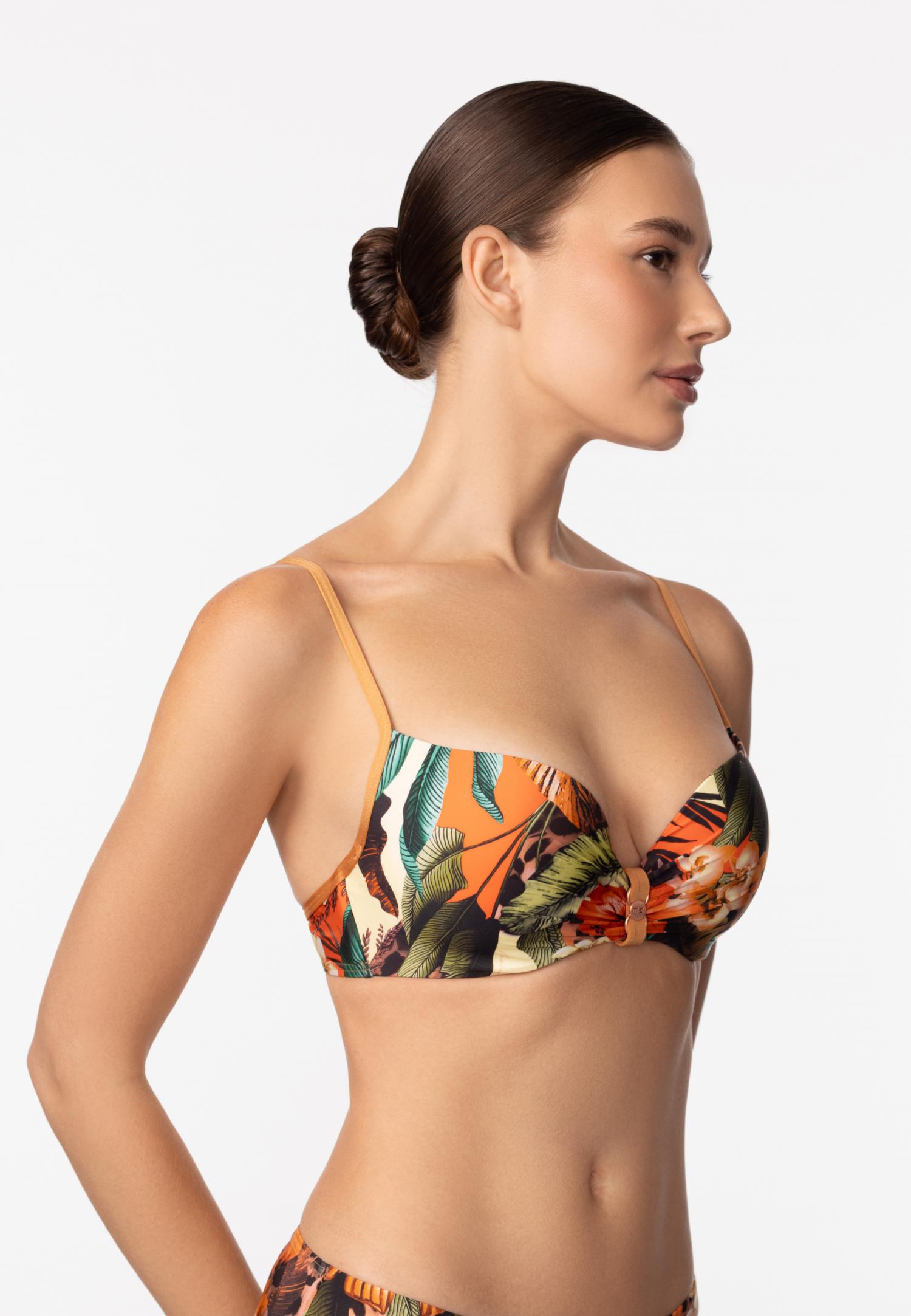 Формована чашка на каркасній підтримці. Знімні коректори «пуш-ап» для розмірів 38-42СD. Спереду є аксесуар. Регульовані бретелі. На спині є застібка.