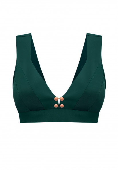 Верх купальника топ без кісточок. Глибокий V-подібний виріз по лінії декольте і на спині. Еластична резинка під грудьми добре підтримує бюст. Лазерна обробка краю бретелей, лінії декольте і вирізу на спині. Знімні вкладиші.