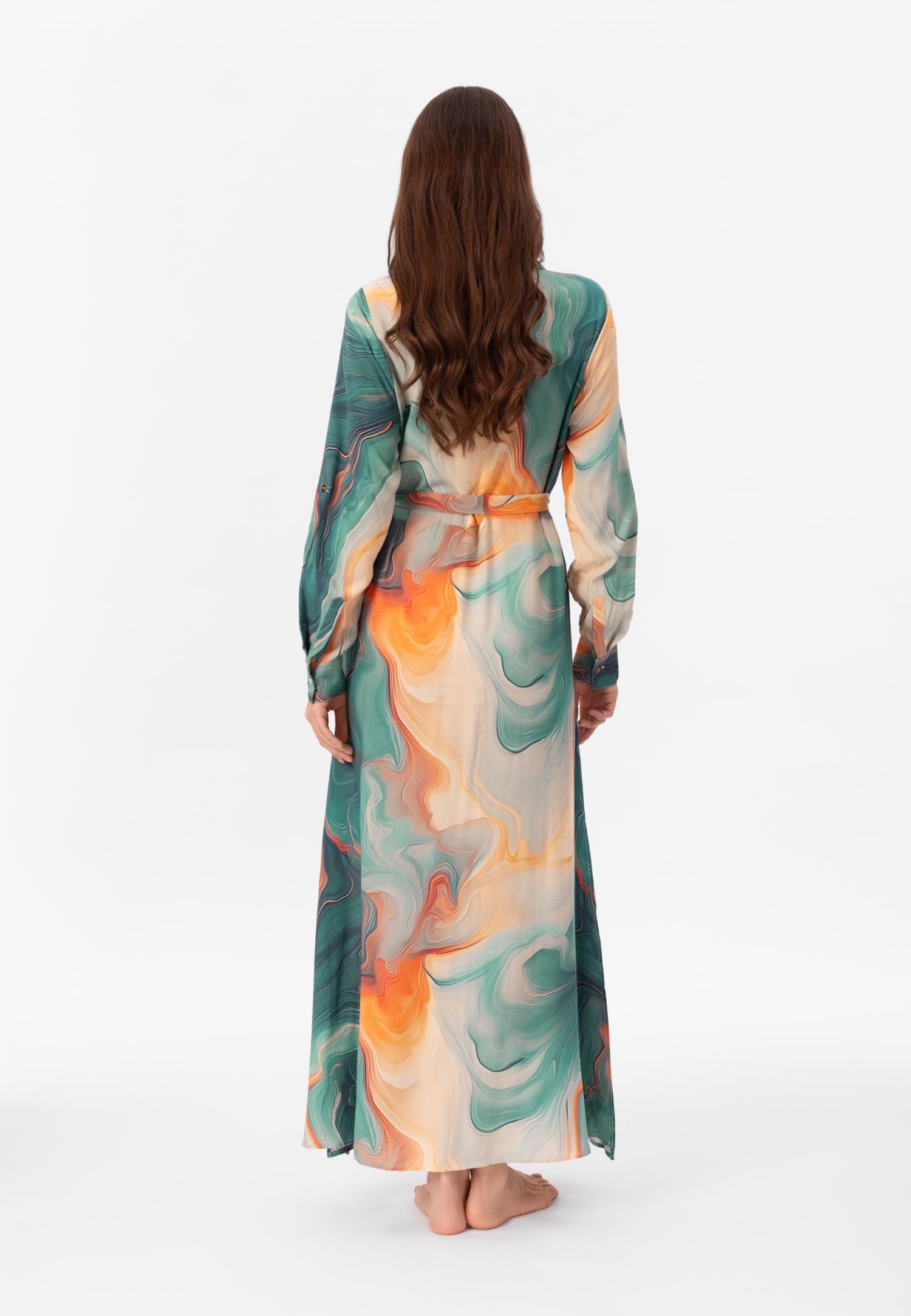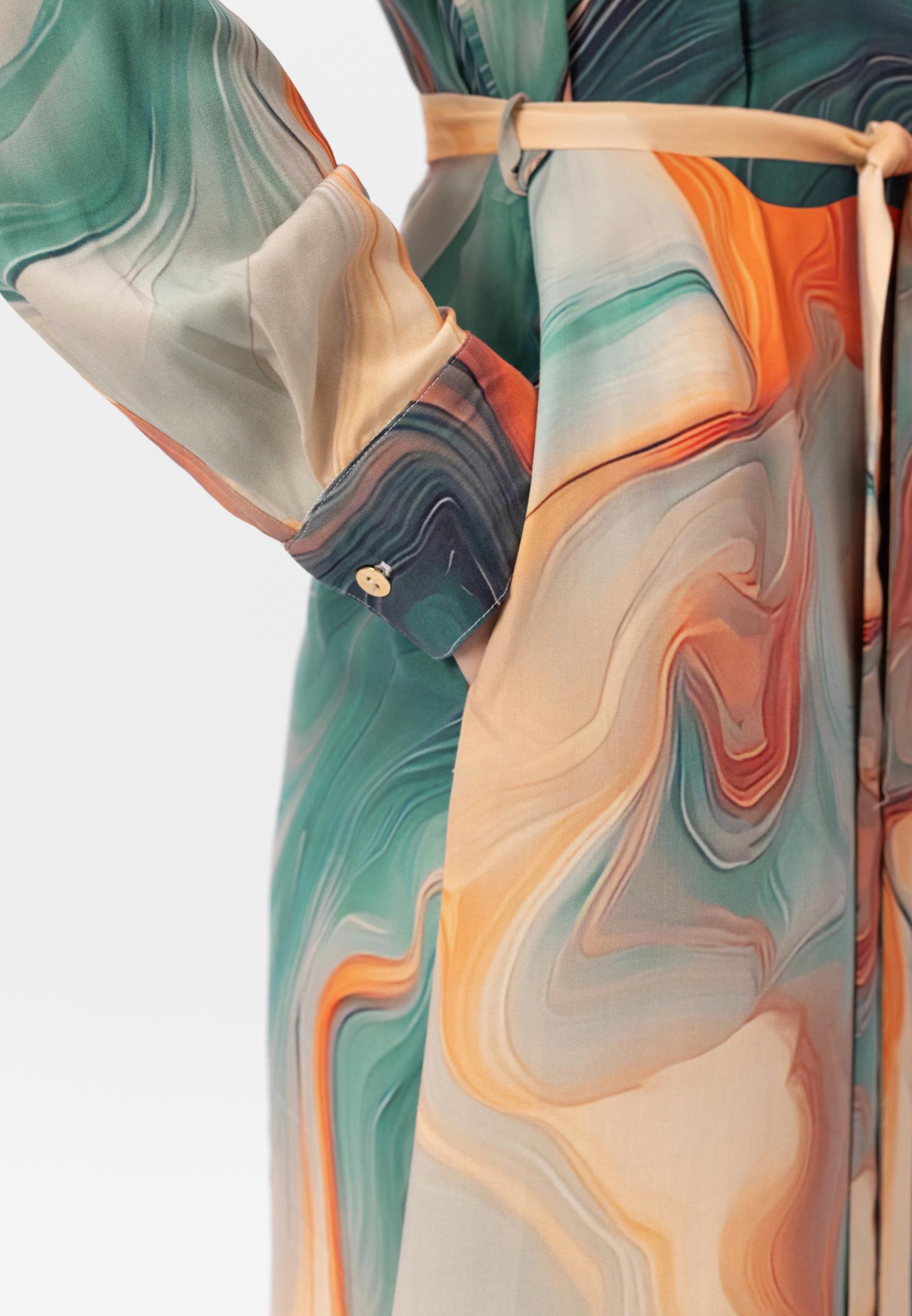 Серія SEA SWIRLS – ода жіночності та пластиці морських хвиль. Граціозні лінії та м'які драпірування створюють чуттєвий силует, а принт, натхненний океанськими вирами, оживає на тканині. Яскрава контрастна підкладка додає несподіваної зухвалості.