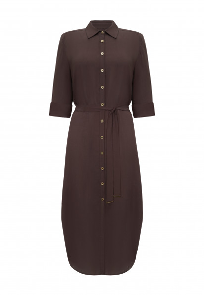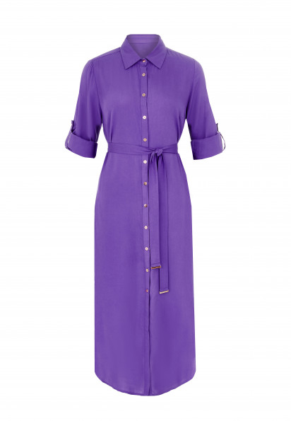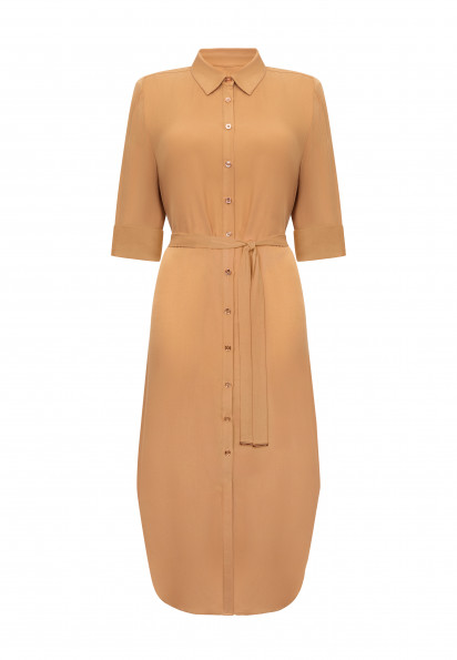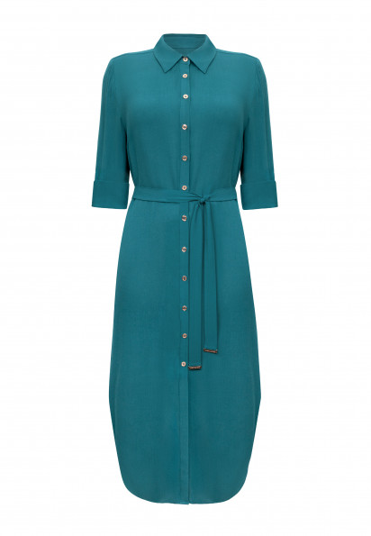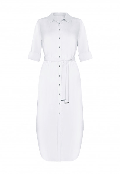 Сукня-сорочка на ґудзиках із дихаючої, м'якої віскозної тканини. Актуальна довжина міді. Закруглений низ із розрізами з боків. Відкладний комір. Довгі рукави з манжетами на ґудзиках. Довжина рукава регулюється патою із застібкою. Знімний пояс із золотими пряжками.