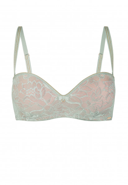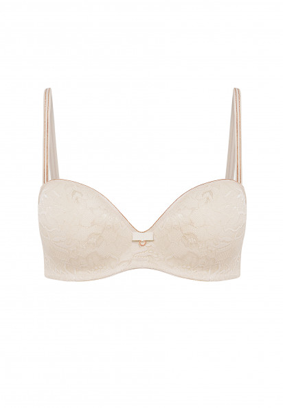 Безкаркасний бюстгальтер-балконет з вбудованим Super «пуш-ап». Візуальне збільшення грудей на два розміри. Ефект «прихованого каркаса». Ущільнений стан для комфортної підтримки, тасьма по нижньому краю. По верхньому і нижньому краю бічних деталей силіконова стрічка, що забезпечує відмінну підтримку навіть без бретелей. Знімні бретелі декоровані подвійною золотою ниткою. Додаткові силіконові бретелі в комплекті.