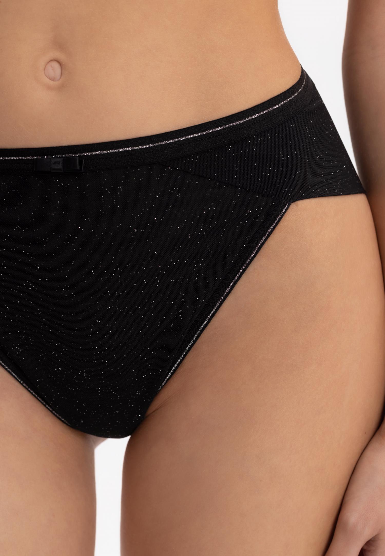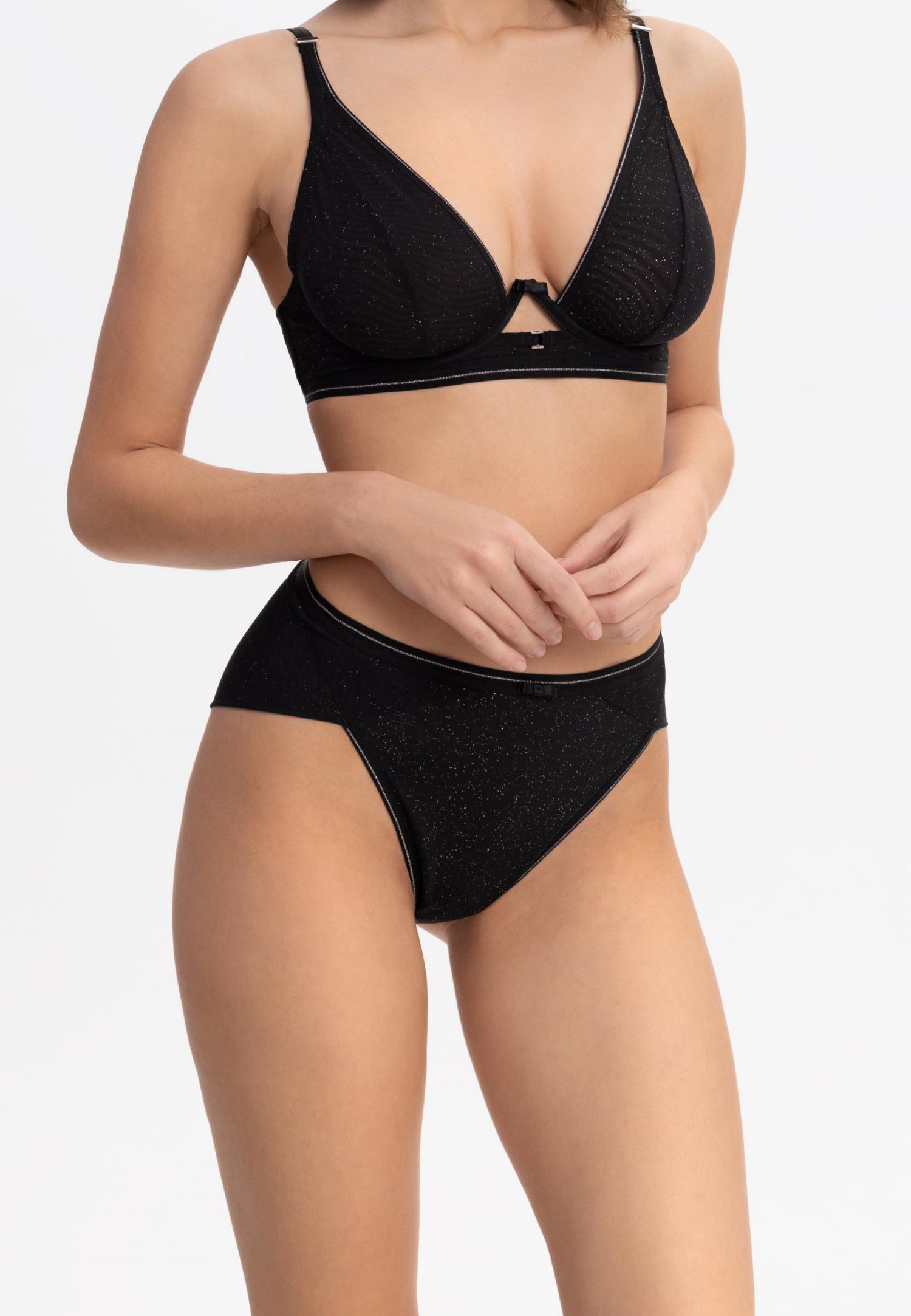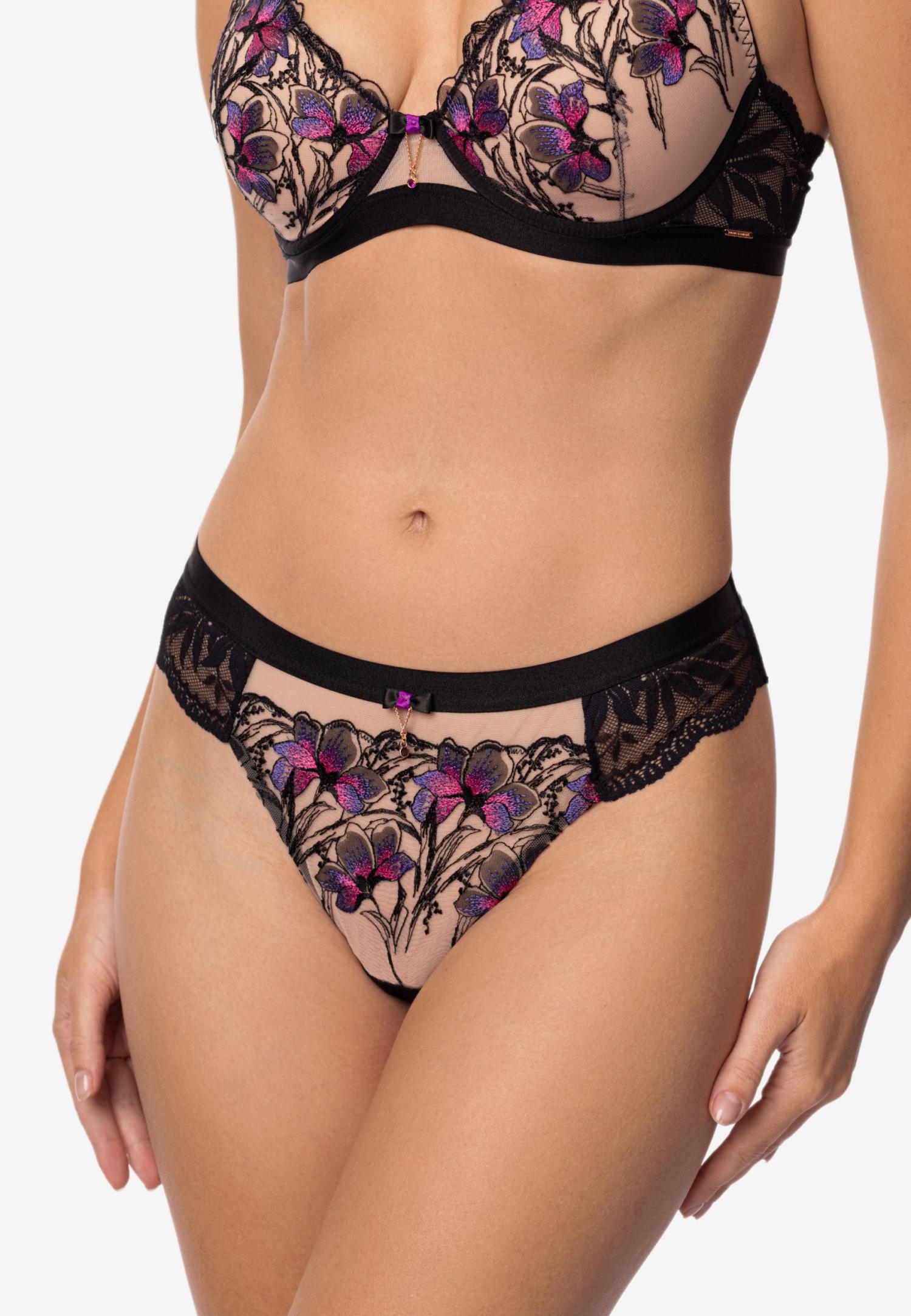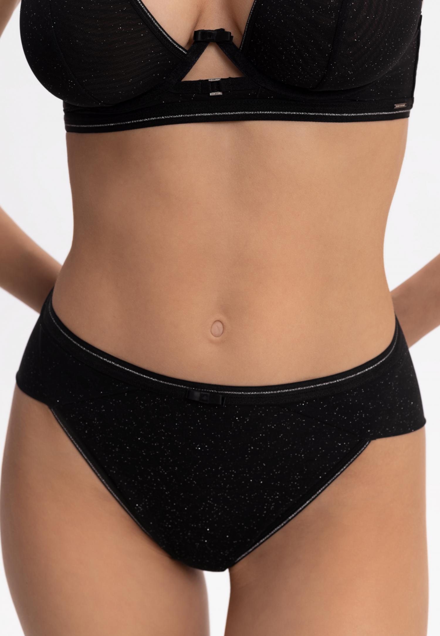 Труси-бразиліана з заниженою лінією талії. Передня деталь з мікрофібри на тонкій підкладці. На задній деталі з обох боків є мереживні вставки з ажурними краями. Декор – підвіска.