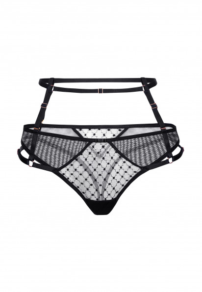 Стрінги із заниженою лінією талії. Передня деталь із сітки з вишивкою. Знімний регульований пояс, дає змогу налаштувати посадку за вашою зручністю.